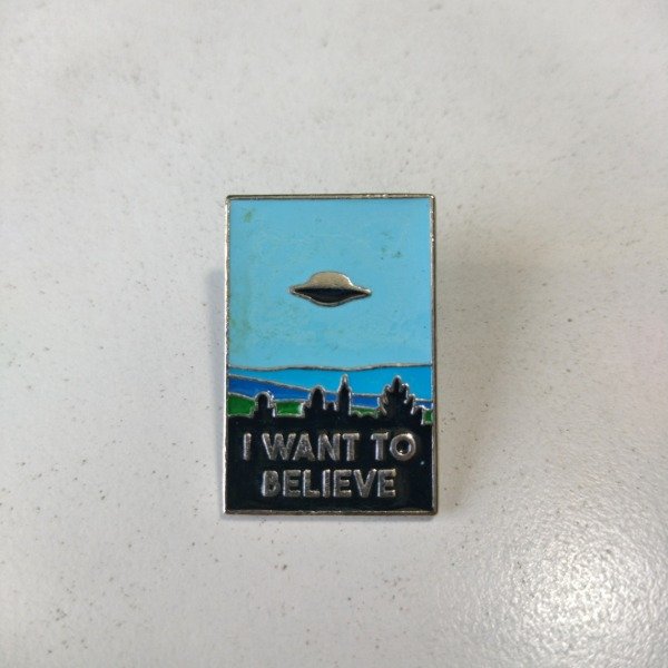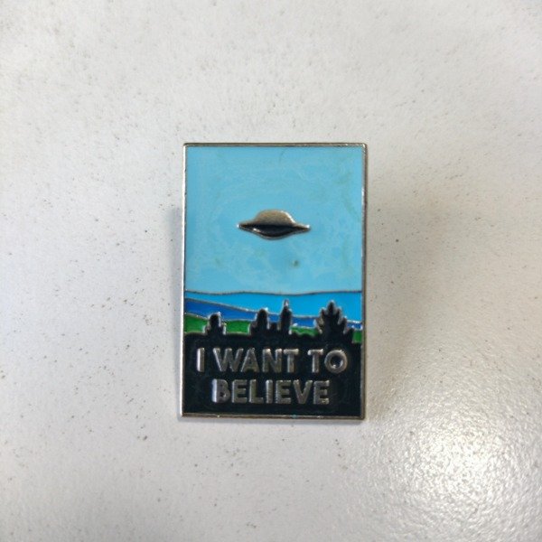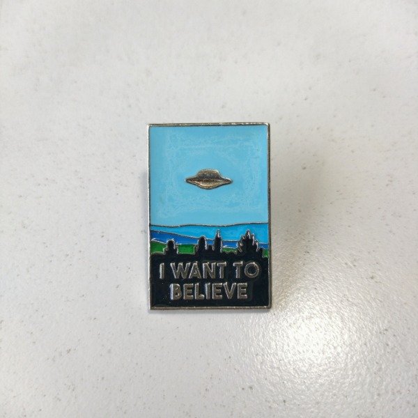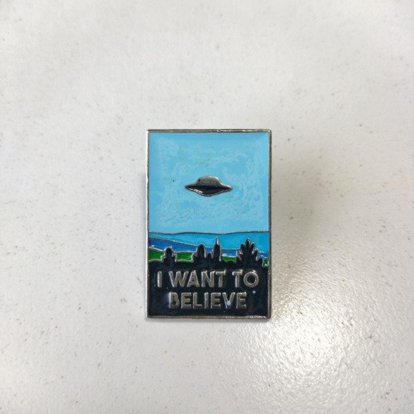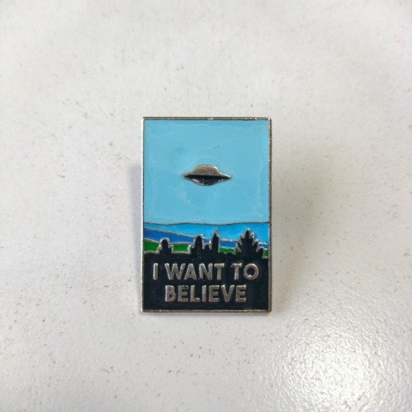Pin metálico esmaltado inspirado en el poster de la oficina de Mulder en X-Files.